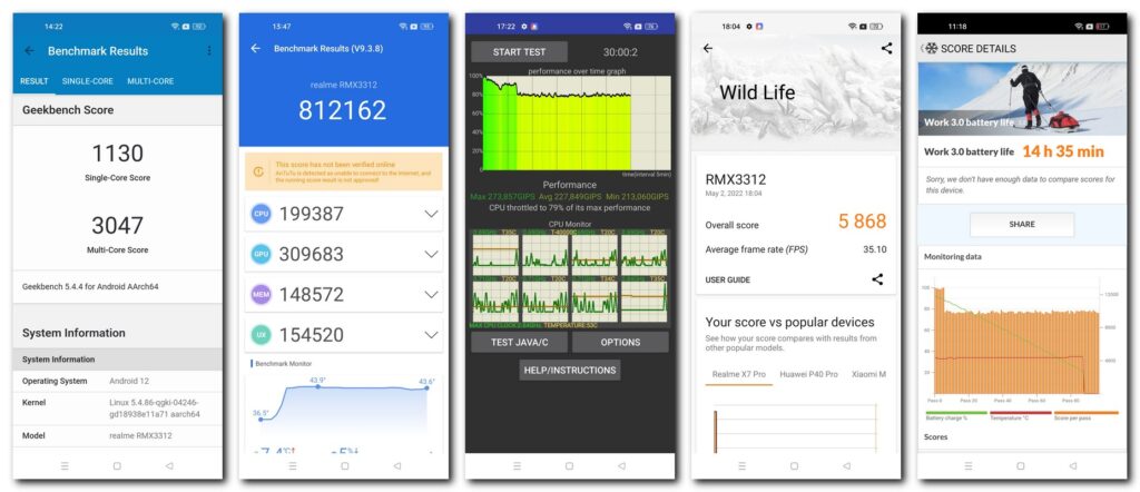 The Realme GT2 is powered by Qualcomm’s flagship Snapdragon 888 SoC built on a 5nm process. It comes with Adreno 660 GPU, 8GB/12GB RAM and 128GB/256GB storage. The device has a stainless steel vapor cooling system and 4129mm² Super VC area. With this arsenal at its disposal, the GT 2 scored 8,12,162 points in the AnTuTu benchmark test and 1,130 and 3,047 points in Geekbench’s single-core and multi-core tests respectively.