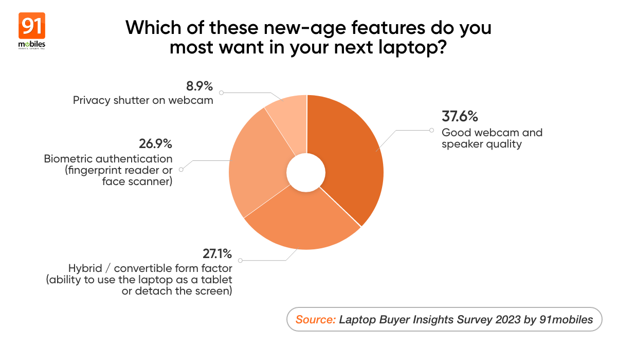 - We asked respondents what essential features they wanted to see in a laptop. 37.2 percent said they wanted a laptop with a good webcam and speaker quality, which isn’t surprising given the work-from-home nature of many businesses during and after the pandemic.