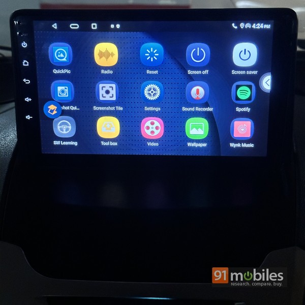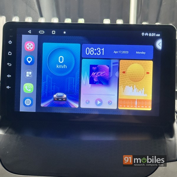 While most usage is touch-driven, you do find a row of backlit capacitive buttons to the left of the screen, including standard controls like power, home, back, and volume up/down. Home and back functions are also available in the form of soft keys on top, as well as a recent apps key. The default home screen is made up of large, colorful tiles that give you a speedometer, time and date, and direct access to the music player and FM radio. A stationary dock is placed on the left side, which gives you access to the video player, NaviMaps, phone and settings. At the top, you also have a dedicated app drawer, where you can see all installed apps, and as with any Android phone or tablet, you can swipe down from the top of the screen to access the toggles. . Adjusting settings and screen brightness etc.
